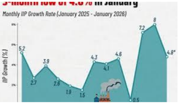• Broad-based Deceleration: India’s industrial activity, measured by the Index of Industrial Production (IIP), hit a three-month low of 4.8% in January 2026, dropping sharply from the 26-month high of 8% (revised) recorded in December 2025. • Sectoral Performance: The manufacturing sector, which holds the largest weight in the index, slowed to 4.8%, while mining and electricity also witnessed moderated growth at 4.3% and 5.1% respectively, reflecting a cooling off from previous peaks. • Infrastructure as an Outlier: Defying the general trend, the infrastructure and construction goods sector accelerated to 13.7%, the highest since August 2023, indicating sustained government capital expenditure and robust building activity. • Consumption Weakness: A significant point of concern is the consumer non-durables sector, which contracted by 2.7%, suggesting a dip in rural and semiurban demand for fast-moving consumer goods (FMCG). • Capital Goods Slump: The capital goods sector—a key proxy for private investment—continued its downward trajectory for the second consecutive month, slowing to 4.3% from a high of 10.1% just two months prior. Key Definitions • Index of Industrial Production (IIP): An abstract number that represents the status of production in the industrial sector for a given period compared to a base year (currently 2011-12). It is a short-term indicator of industrial growth. • Capital Goods: Physical assets that a company uses in the production process to manufacture products and services that consumers will later use (e.g., machinery, equipment). • Consumer Non-Durables: Goods that are used up immediately or have a short life span (typically less than 3 years), such as food, beverages, and toiletries. Constitutional & Legal Provisions • Article 246 & Seventh Schedule: Industrial development falls under the Union List (Entry 52) for industries declared by Parliament to be of public interest, and the State List (Entry 24) for others. • National Policy on Statistics: The data is compiled and released monthly by the National Statistical Office (NSO), Ministry of Statistics and Programme Implementation (MoSPI), ensuring transparency and evidence-based policymaking. • Fiscal Responsibility and Budget Management (FRBM) Act: Industrial performance directly impacts the government\'s tax revenue (GST and Corporate Tax), influencing the fiscal deficit targets mandated under this Act. Additional Key Points • Base Effect: Some of the slowdown can be attributed to a high base effect from the previous year, though the sequential month-on-month drop indicates genuine cooling in certain segments. • Core Industries Impact: Since the \'Eight Core Industries\' comprise nearly 40.27% of the weight in IIP, their performance (Coal, Crude Oil, Natural Gas, Refinery Products, Fertilizers, Steel, Cement, and Electricity) remains the primary driver of these figures. • Rural Demand Pulse: The contraction in non-durables is often read by economists as a signal of high inflation impacting the purchasing power of lower-income households. Conclusion The January 2026 IIP data presents a dual narrative: while the \'Steel and Cement\' driven infrastructure sector remains a powerhouse due to public spending, the slowdown in manufacturing and contraction in consumer non-durables point toward an uneven recovery. Addressing the stagnation in private capital investment and reviving rural consumption will be critical for maintaining an annual industrial growth trajectory above the 7% mark. UPSC Relevance • GS Paper III: Indian Economy and issues relating to planning, mobilization of resources, growth, development, and employment; Industrial policy and its effects on industrial growth. • Prelims: Understanding the difference between IIP and ASI (Annual Survey of Industries), the base year of IIP, the frequency of release, and the weightage of the eight core industries. • Economic Survey/Budget: These monthly trends form the basis for the macroeconomic projections presented in the Parliament.