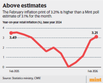 India’s retail inflation, measured by the Consumer Price Index (CPI), rose to 3.21% in February 2026, primarily driven by a surge in the prices of food, beverages, clothing, and housing services. This uptick follows a period of historic lows, including a record-low headline inflation of 0.25% in October 2025. Despite the rise, inflation remains well within the Reserve Bank of India’s (RBI) mandated target range of 2% to 6%, though the recent volatility in West Asia and its impact on global fuel and food supply chains remain a significant concern for future price stability. • Inflationary Rebound: After a prolonged period of disinflation where food inflation even turned negative (reaching -5.02% in late 2025), February saw a reversal with headline inflation climbing to 3.21%. • New Base Year Impact: The current data reflects a revised CPI series with 2024 as the base year, replacing the 2012 series to better represent modern consumption patterns; this transition makes direct year-on-year comparisons with the old series complex. • Food Basket Dominance: Food and beverages continue to be the primary drivers of the CPI; sharp swings in these perishable often dictate the \'headline\' figure, necessitating a focus on supply-side management. • External Pressure Points: Geopolitical disruptions in West Asia are exerting upward pressure on the \'Fuel and Light\' and \'Transport\' categories, complicating the inflation outlook for the upcoming fiscal quarters. • Monetary Policy Stance: Despite inflation staying within the threshold, the RBI\'s Monetary Policy Committee (MPC) is expected to maintain a \'status quo\' on key interest rates in April to guard against potential inflationary shocks from global energy markets. • Sectoral Price Rise: Beyond food, the February print highlights rising costs in utility services and clothing, suggesting a gradual broadening of inflationary pressures across the non-food components of the basket. Key Definitions • Consumer Price Index (CPI): A measure that examines the weighted average of prices of a basket of consumer goods and services, such as transportation, food, and medical care, representing the inflation experienced by the end-consumer. • Base Year: The specific year used as a benchmark for the price index; 2024 is the current base year for India\'s CPI, used to account for changes in the consumption structure over time. • Headline Inflation: The total inflation within an economy, including commodities such as food and energy prices, which tend to be much more volatile than the core components. • Monetary Policy Committee (MPC): A statutory body under the RBI Act, 1934, responsible for fixing the benchmark policy interest rate (Repo Rate) to contain inflation within the specified target level. Constitutional and Legal Provisions • Article 246 (Seventh Schedule): Prices and economic planning are subjects that involve both the Union and the States; however, the regulation of the banking sector and national monetary policy falls strictly under the Union List (Entry 38). • RBI Act, 1934 (Section 45ZB): Provides the legal basis for the constitution of the Monetary Policy Committee (MPC) to ensure price stability while keeping in mind the objective of growth. • Inflation Targeting Framework: A formal agreement between the Government of India and the RBI (signed in 2015) that mandates the RBI to maintain retail inflation at 4% with a margin of +/-2%. • Collection of Statistics Act, 2008: The legal framework under which the Ministry of Statistics and Programme Implementation (MoSPI) collects data for various indices including CPI and IIP. Conclusion The rise in February retail inflation to 3.21% signals the end of the \'disinflationary sweet spot\' witnessed in late 2025. While the current levels are comfortable relative to the 6% upper tolerance limit, the confluence of a new base year and external geopolitical risks necessitates a cautious approach. The transition to the 2024 base year is a critical step in making the data more reflective of ground realities, but it also requires policymakers to recalibrate their understanding of \'normal\' price movements in a post-transition economy. UPSC Relevance • GS Paper III: Indian Economy and issues relating to planning, mobilization of resources, growth, development, and employment; Inflationary trends and monetary policy. • Prelims: Understanding the difference between CPI and WPI, the role of MoSPI vs. RBI, the composition of the CPI basket, and the significance of \'Base Year\' revisions. • Key Concept: The impact of \'imported inflation\' (via fuel) on the domestic CPI and the fiscal-monetary coordination required to tackle supply-side inflation.