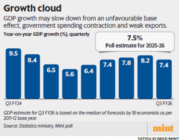 India\'s Gross Domestic Product (GDP) growth for the third quarter (October-December) of FY26 is projected to moderate to 7.4%, down from 8.2% in the preceding quarter. While festive demand and GST-related benefits provided a cushion, the deceleration highlights the impact of fiscal consolidation and global headwinds on the domestic economy. Key Highlights of the Economic Outlook • Growth Moderation: The expected growth rate of 7.4% marks a sequential slowdown attributed to an unfavorable base effect and a contraction in government capital expenditure. • Fiscal Drag: A significant reduction in central government capital spending and subdued revenue expenditure by state governments have acted as primary dampeners on domestic demand. • External Headwinds: Weakness in merchandise exports persists as a major challenge, reflecting sluggish global demand and geopolitical disruptions affecting trade routes. • Consumption Resilience: Sustained momentum in festive-season demand and targeted GST rate cuts helped offset some of the structural slowdown in other sectors. • Revised Projections: Economists project a full-year growth of 7.5% for FY26, slightly more optimistic than the Reserve Bank of India’s (RBI) estimate of 7.3%. • Base Year Transition: The upcoming data release will transition the GDP base year from 2011-12 to 2022-23, a technical overhaul likely to cause a revision in historical and current growth figures. Important Definitions • Gross Domestic Product (GDP): The total monetary value of all finished goods and services produced within a country\'s borders in a specific time period. • Base Effect: The distortion in a current period\'s growth figures caused by an unusually low or high level of the same variable in the corresponding period of the previous year. • Capital Expenditure (Capex): Funds used by a government to acquire, upgrade, and maintain physical assets such as property, plants, or infrastructure; it has a high multiplier effect on the economy. • First Advance Estimates (FAE): The first official estimate of GDP for a financial year, released by the Ministry of Statistics and Programme Implementation (MoSPI) before the fiscal year ends. Constitutional and Legal Provisions • Article 112: Mandates the presentation of the Annual Financial Statement (Budget), which outlines the government\'s estimated receipts and expenditure, directly influencing GDP through fiscal policy. • FRBM Act, 2003: The Fiscal Responsibility and Budget Management Act sets targets for the government to reduce fiscal deficits; spending cuts mentioned in the poll often stem from attempts to align with these legal mandates. • Article 246A: Grants the power to make laws with respect to Goods and Services Tax (GST); changes in these rates are used as a fiscal tool to stimulate or cool down consumption. • Collection of Statistics Act, 2008: Provides the legal framework for the government to collect socioeconomic data, including the census and surveys required for GDP base year revisions. Additional Key Insights • The Multiplier Effect: While government spending cuts help in fiscal consolidation, they can lead to a short-term reduction in \'crowding in\' private investment, as seen in the Q3 projections. • Base Year Realignment: Moving the base year to 2022-23 is crucial to capturing the structural changes in the Indian economy post-pandemic, including the rise of the digital economy and new manufacturing hubs. • GVA vs. GDP: While GDP measures the demand side, Gross Value Added (GVA) provides a picture from the supply side; economists often look at both to identify whether growth is led by taxes or actual production increases. Conclusion The projected moderation in Q3 GDP growth serves as a reminder of the delicate balance between fiscal prudence and economic stimulus. While private consumption remains a sturdy pillar, the contraction in public spending and export volatility necessitate a more diversified growth strategy. The upcoming base year revision will be a landmark event, providing a more accurate \'mirror\' to India’s evolving economic landscape and potentially altering the narrative on India\'s growth trajectory. UPSC Relevance • GS Paper III: Indian Economy and issues relating to planning, mobilization of resources, growth, development, and employment; Government Budgeting. • Mains Focus: Analyzing the impact of fiscal consolidation on economic growth and the significance of updating economic indices like the GDP base year. • Prelims Focus: Components of GDP, the role of MoSPI and CSO, concepts of base effect, and the relationship between Capex and GVA.