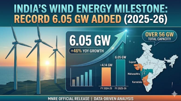 Context: The Ministry of New and Renewable Energy (MNRE) has announced that India added a historic 6.05GW of wind energy capacity during the 2025-26 fiscal year. This achievement surpasses the previous record of 5.5GW set in 2016-17, signaling a major revival in the wind power sector and reinforcing India’s commitment to its \'Panchamrit\' climate targets. Analysis of Wind Energy Growth and Strategic Drivers • Historic Milestone: The addition of 6.05GW in a single fiscal year has pushed India’s cumulative installed wind power capacity beyond 56GW. This represents a significant acceleration in deployment compared to the stagnant growth observed over the past decade. • Policy and Regulatory Tailwinds: The surge is attributed to improved policy clarity, including the transition from physical e-auctions to a closed-envelope bidding system in certain segments, and the implementation of a defined bidding trajectory of 50GW of renewable energy capacity annually. • Infrastructure Readiness: Enhanced transmission readiness and the development of Green Energy Corridors have reduced \'curtailment\' risks, encouraging independent power producers (IPPs) to execute a strong pipeline of pending projects. • Competitive Tariff Discovery: Technological advancements in turbine efficiency (higher hub heights and larger rotors) have allowed for competitive tariff discovery, making wind-solar hybrid projects more commercially viable for Discoms. • Repowering Potential: A significant portion of the momentum also stems from the government’s focus on \'Repowering\' older, low-capacity wind turbines at prime sites with modern, highcapacity versions to maximize land-use efficiency. • Global Standing: With this addition, India continues to solidify its position as one of the global leaders in wind energy, trailing only behind China, the USA, and Germany in total installed capacity. Essential Definitions • Installed Capacity: The maximum theoretical electric output a power plant can produce under ideal conditions. • Repowering: The process of replacing older wind turbines with newer, more efficient ones to increase the energy yield from the same site. • Transmission Readiness: The availability of high-voltage power lines and sub-stations required to carry electricity from the point of generation (wind farms) to the national grid. Constitutional and Legal Framework • Article 48A (DPSP): Directs the State to protect and improve the environment. Promoting renewable energy is a core strategy to fulfill this constitutional mandate. • Article 51A(g): Fundamental duty of every citizen to protect and improve the natural environment. • Electricity Act, 2003: The primary legislation governing the power sector, which mandates State Electricity Regulatory Commissions (SERCs) to specify a percentage of electricity purchase from renewable sources (Renewable Purchase Obligation - RPO). • National Wind-Solar Hybrid Policy, 2018: Provides a framework for the promotion of large gridconnected wind-solar PV hybrid systems for optimal utilization of transmission infrastructure and land. Conclusion The record-breaking addition of 6.05GW marks a turning point for India’s wind energy sector, which had long been overshadowed by the rapid growth of solar power. To maintain this momentum, the focus must now shift toward harnessing the vast offshore wind potential along the coasts of Gujarat and Tamil Nadu. Addressing land acquisition hurdles and ensuring timely payments by Discoms will be crucial for achieving the 2030 target of 500GW of non-fossil fuel capacity. UPSC Relevance • GS Paper III (Economy & Infrastructure): Energy sector, renewable energy targets, and the role of infrastructure in economic growth. • GS Paper III (Environment): Climate change mitigation, COP26/COP28 commitments, and the transition to a low-carbon economy.